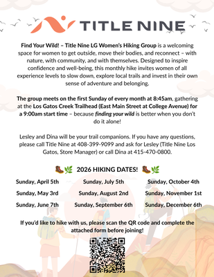 Find Your Wild! - Title Nine LG Women's Hiking Group is a welcoming space for women to get outside, move their bodies, and reconnect - with nature, with community, and with themselves. Designed to inspire confidence and well being, this monthly hike invites women of all experience levels to slow down, explore local trails and invest in their own sense of adventure and belonging.
