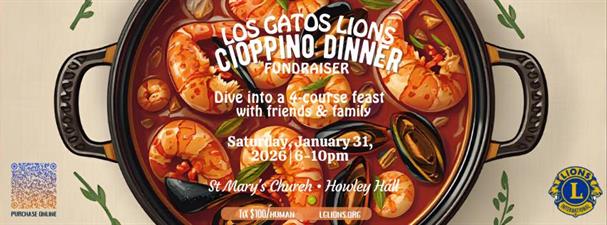 Save the date, Saturday, January 31, 2026 for the awesome Lions Club Cioppino dinner, at St. Mary's Church Howley Hall, 6-10 PM. The event features a four course sumptuous dinner, raffle, live auction and a wine locker raffle. Tickets $100 each.Los Gatos Lions Club Cioppino Dinner ...Date and Time